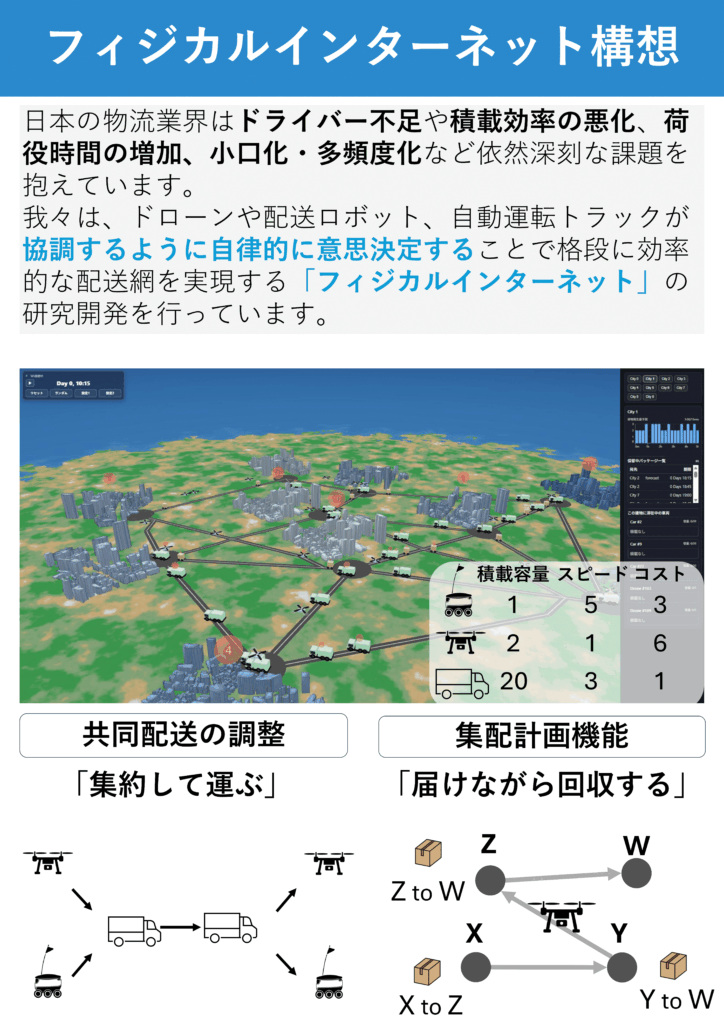 本展示ではドローンや配送ロボット、自動運転トラックが協調するように自律的に意思決定することで格段に効率的な配送網を実現する「フィジカルインターネット」構想を発表いたしました。